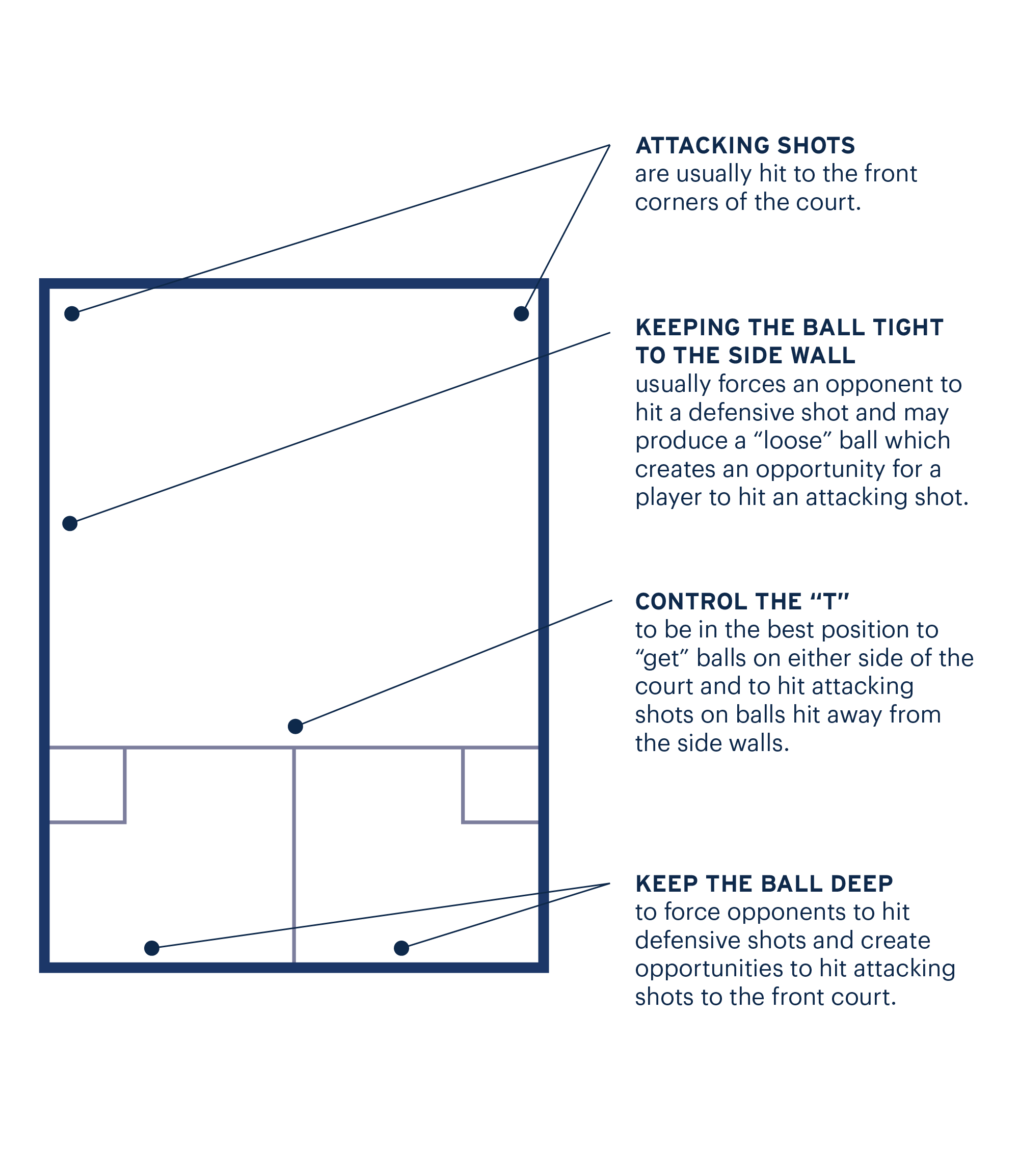 On each shot the ball can hit any number of walls, but MUST hit the front wall once, MUST stay within the court boundaries (marked near the top of the walls) and MUST NOT hit the tin. The ball can bounce ONLY ONCE on the floor.